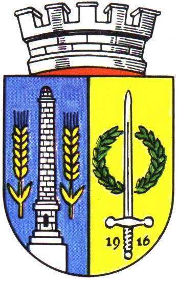 Překlad (doslovný a nepřizpůsobený skladbou vět české mluvnici - SK): „Modrou a zlatou rozštípený štít. V pravém poli se zvedá ze stříbrných kvádrů postavený tovární komín, provázený po jednom stylizovaném zlatém obilném klasu. V levém poli se objevuje kolmo nahoru směřující obnažený meč, jehož čepel vavřínový věnec obklopuje, po obou stranách rukojeti je rovnoměrně rozdělený letopočet 1916 v černých číslicích umístěn. Na horním okraji štítu spočívá stříbrná zděná koruna s pěti viditelnými stínkami.“
