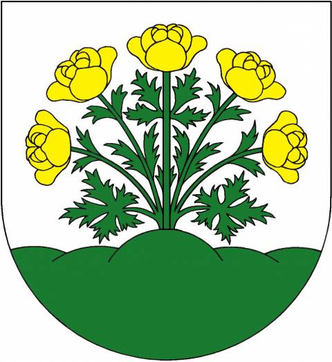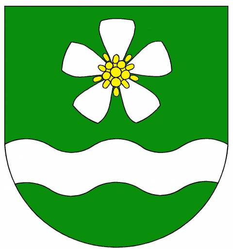 Červeno-stříbrně polcený štít. Vpravo stříbrný, zlatě zdobený přední plech se šosy podložený vztyčeným zlatým mečem. Vlevo tři červené KVĚTY NETŘESKU se zlatými semníky na lodyhách, prostřední vyšší, vyrůstající z růžice, obojí zelené.