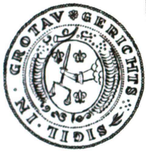 (D) Soudní pečeť – průměr 30 mm (červený vosk). Opis: GERICHTS [ SIGIL IN GROTAV („Soudní pečeť v Hrádku“). V pečetním poli, jehož vnější okraj je bohatě zdoben různými motivy, vyniká z pravého horního rohu obrněná, v lokti ohnutá ruka, držící vztyčený meč, z jehož hrušky visí miskové váhy. Čepel meče provází na každé straně lilie a pod loktem je třetí. Jestliže ruka s mečem a váhami symbolizují „trestající rameno spravedlnosti“, pak lilie jsou jednoznačně odvozeny od pečeti města.