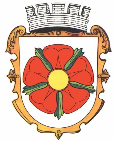 Ideální popis historického městského znaku Mezimostí: Ve stříbrném štítě červená růže se zlatým semeníkem a zelenými kališními lístky.