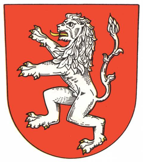 Ideální popis historického městského znaku Veselí nad Lužnicí: V červeném štítě stříbrný lev se zlatou zbrojí.