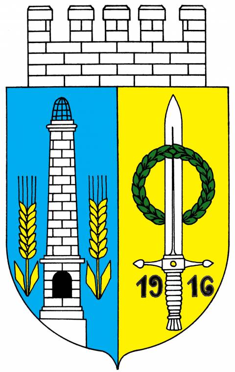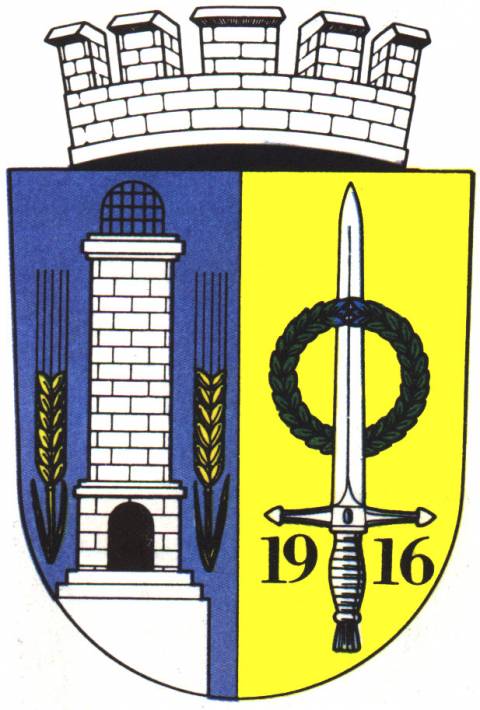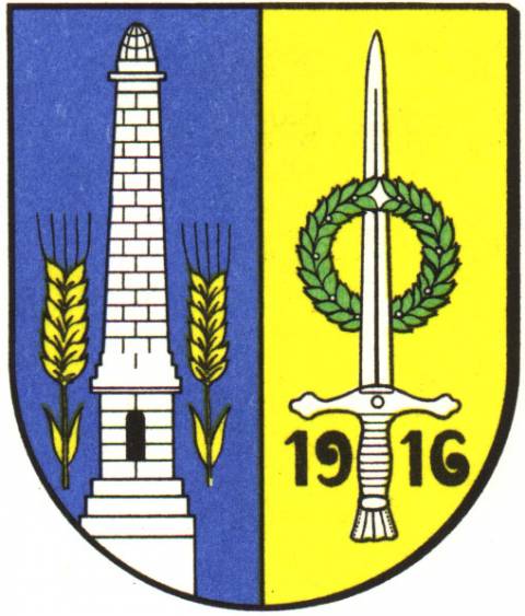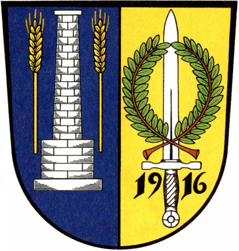 Překlad (doslovný a nepřizpůsobený skladbou vět české mluvnici - SK): „Modrou a zlatou rozštípený štít. V pravém poli se zvedá ze stříbrných kvádrů postavený tovární komín, provázený po jednom stylizovaném zlatém obilném klasu. V levém poli se objevuje kolmo nahoru směřující obnažený meč, jehož čepel vavřínový věnec obklopuje, po obou stranách rukojeti je rovnoměrně rozdělený letopočet 1916 v černých číslicích umístěn. Na horním okraji štítu spočívá stříbrná zděná koruna s pěti viditelnými stínkami.“