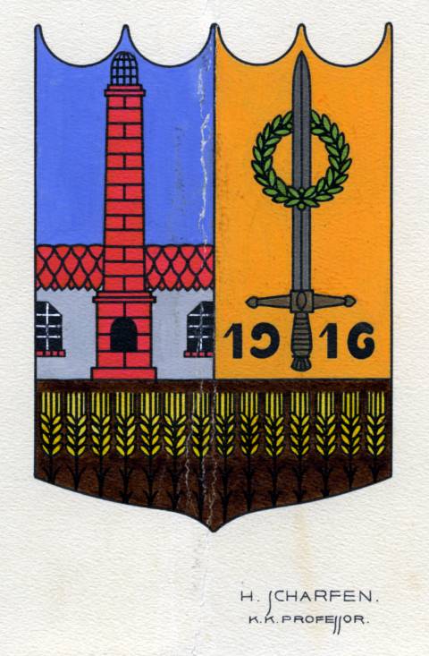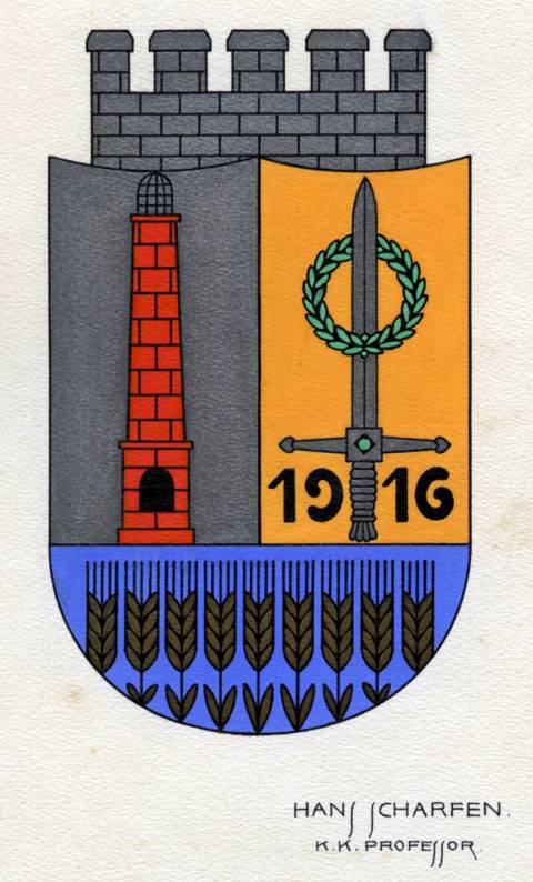 Popis znaku v privilegiu zní: „Ein von Blau und Gold gespaltener Schild. In dem rechten Felde erhebt sich ein aus Silber quadern erbauter Fabriksschlot, begleitet von je einer stilisierten goldenen Getreideähre. In dem linken Felde erscheint ein pfahlweise auf gerichtetes blankes Schwert, dessen klingen ein Lorbeerkranz umgibt, zu beiden seiten des Griffes ist die gleichmäßig verteilte Jahreszahl 1916 in schwarzen Ziffern angebracht. Auf dem Hauptrande des schildes ruht eine silberne Mauerkrone mit fünf sichtbaren Zinnens.“.