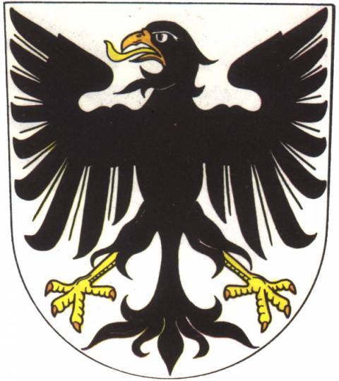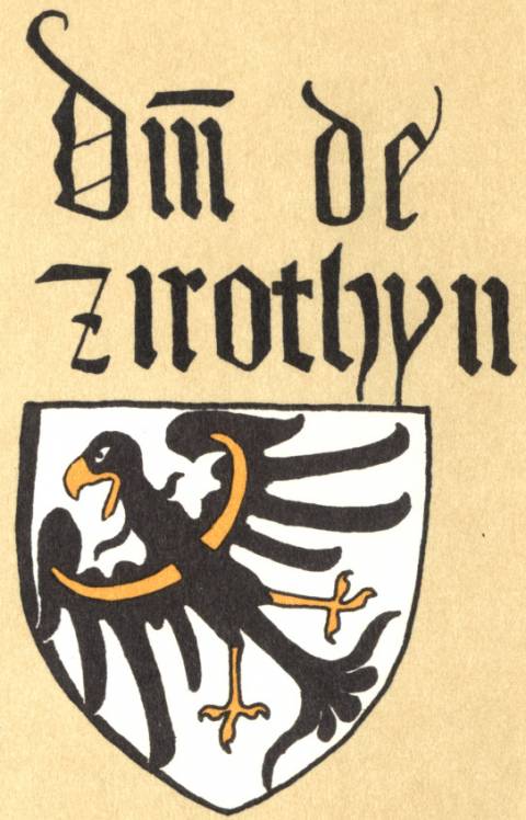 Erb pánů ze Žirotína z roku 1361 na hradě v Lauf a. d. Pegnitz (kresba Aleš Zelenka, nápis nepřesně)