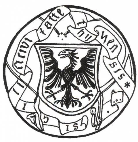 1 – Kruhová pečeť o průměru 47 mm. V pečetním poli je architektonicky pojatá žebrová kružba ve tvaru srdce a v ní je štít s figurou orlice. Okolo štítu se kružbou proplétá několikrát přeložená nápisová páska s opisem v gotické minuskule (páska i opis začíná dole pod štítem – jednotlivé části na pásce jsou v následujícím přepisu odděleny dvojitým lomítkem): si // gi // l // lv // m civi // tatte // t // hy // nen // sis ¬ // // v (viz také Liška, Karel: Sbírka komunálních znaků, pečetí a razítek. IV/1. Znaky, pečeti a razítka českých měst a městeček N – Ř. Brno 2014, s. 61-62, zde je uveden výše zmíněný průměr, dále jen Liška, Sbírka; Matějka, Soupis, 1897, s. 85, Obr. 81, zde uveden průměr 0.049 m).