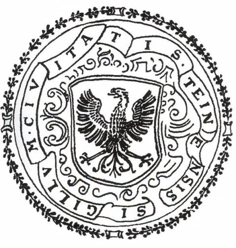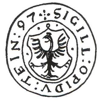 3 – Kruhová pečeť o průměru 26 mm, mezi vnější a vnitřní lištou majuskulní opis: É SIGILL : OPIDV : TEIN : 97. V pečetním poli renesanční štítek s vykrajovanými boky a záclonovitě vykrojenou hlavou štítu. V každém ze čtyř výkrojů je bod. Ve štítě je orlice. Typář je dosud v majetku městyse.