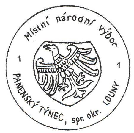 4 – K přehledu pečetí a razítek používaných v Panenském Týnci přidává Karel Liška otisk gumového razítka zdejšího místního národního výboru. V pečetním poli je štítek s kosmou orlicí. Inspirace razítka je nikoliv v předchozích typářích, které se údajně ztratily v letech 1920-1925, ale v plastice erbu pánů ze Žirotína na portálu nedokončeného klášterního kostela, přesněji ve štítu erbu na bráně vpravo. Razítko s opisem „Místní národní výbor“ PANENSKÝ TÝNEC, spr. okr. LOUNY“ bylo použito v roce 1948 (Liška, Sbírka, IV/1, 2014, s. 61–62).