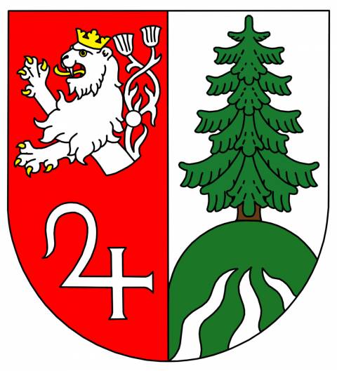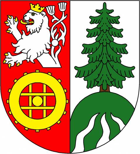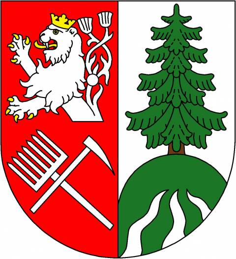 Znak: V červeno-stříbrně polceném štítě vpravo horní polovina stříbrného korunovaného dvouocasého lva se zlatou zbrojí nad středověkou stříbrnou značkou cínu (Jupiter), vlevo na zeleném vrchu, se třemi přivrácenými stříbrnými vlnitými zúženými hroty, přirozený jehličnatý strom.