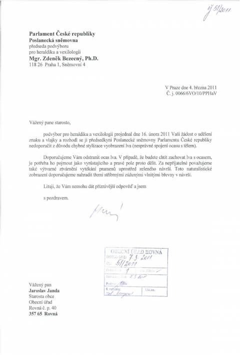 reaguji na Vaše rozhodnutí, které bylo obsahem dopisu předsedy Podvýboru pro heraldiku a vexilologii PS PČR Mgr. Zdeňka Bezecného, Ph.D. ze dne 4. 3. 2011, zamítnout návrh znaku obce Rovná (POÚ Sokolov).